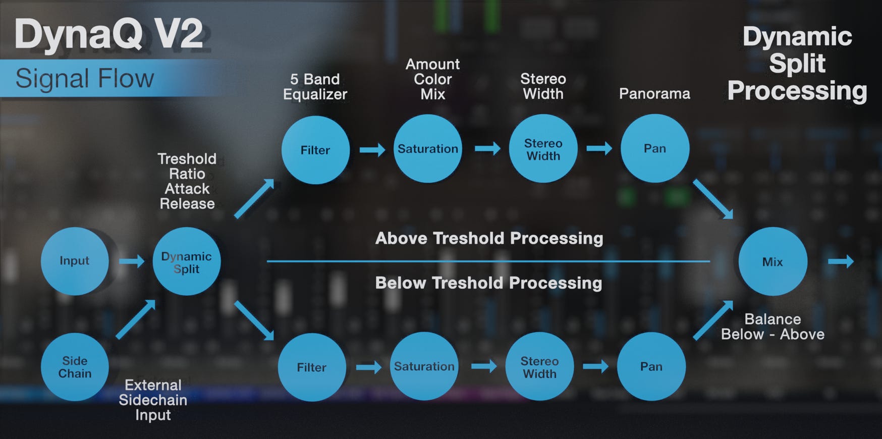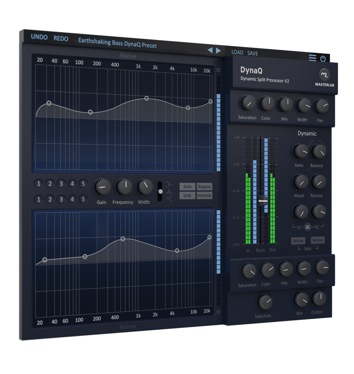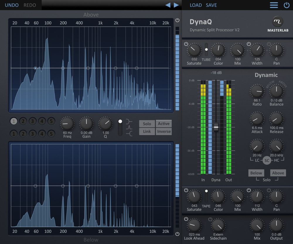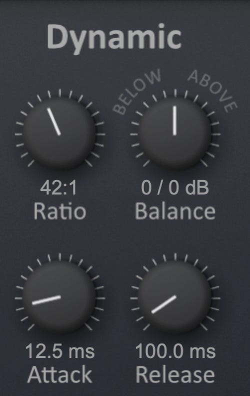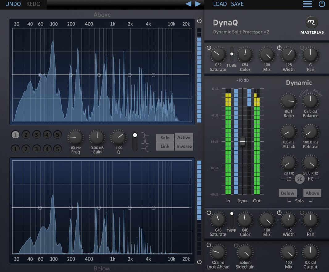 On the other hand, dynamic EQs can be a little bit difficult to understand, especially when it comes to below and above the dynamic threshold of the processing and it is also hard to deal with complex filter curves. Therefore, we invented a complete new but very simple approach to dynamic selective processing. This not only allows to add complex filtering curves very fast, but also analog style saturation and stereo widening.